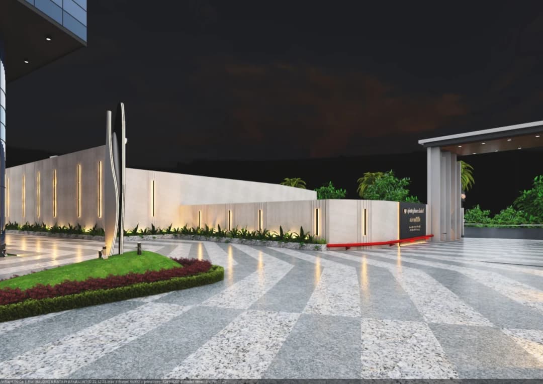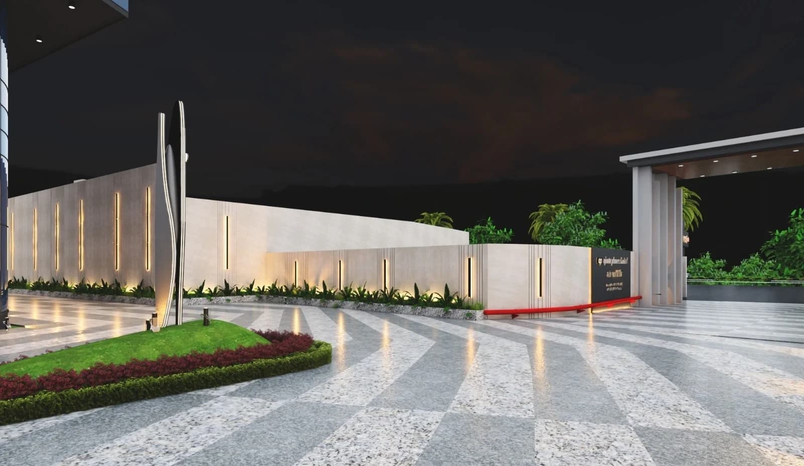 The concept is centered around corporate identity and monumental entrance design. The architecture blends clean modern lines with bold geometries, creating a strong visual language that represents stability and growth. The entrance gateway acts as a signature element, enhancing brand presence while ensuring functional access and security.