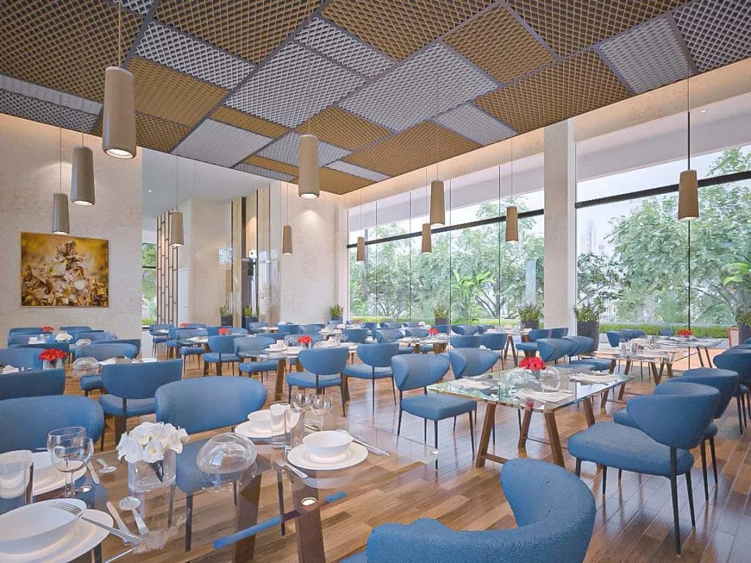 A contemporary hospitality interior designed to deliver a vibrant and spacious dining experience with modern aesthetics and natural light