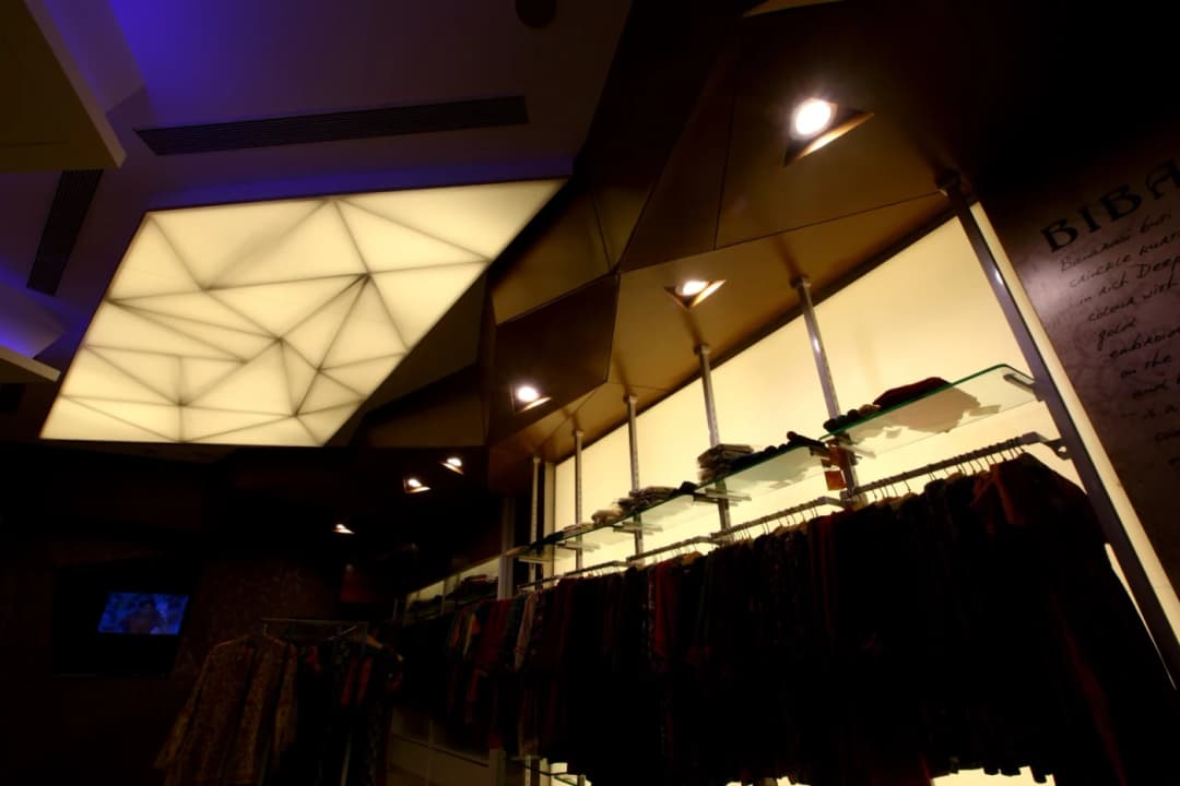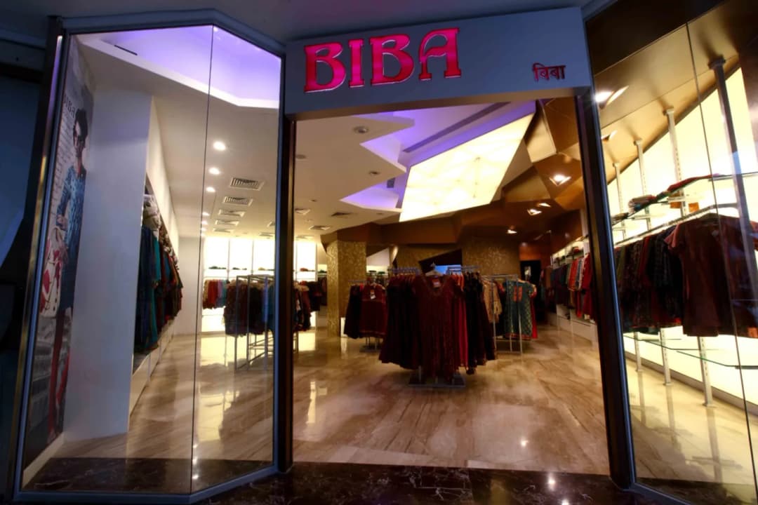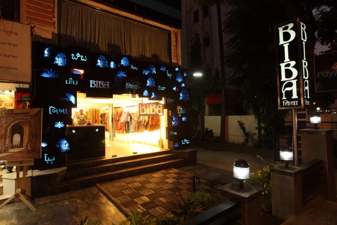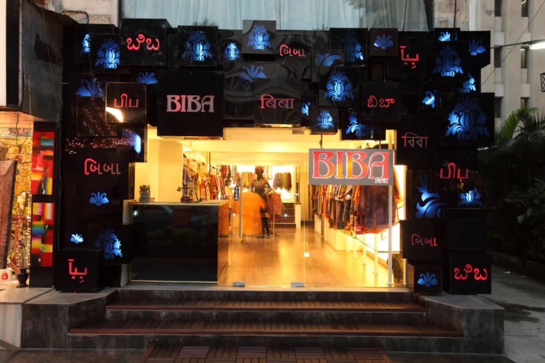 BIBA is a fashion retail storefront designed as a visual experience, using perforated panels with dynamic colored lighting to attract attention and reflect the brand’s vibrant identity. The facade combines pattern, light, and transparency to create an engaging entrance that enhances customer curiosity and increases walk-ins.