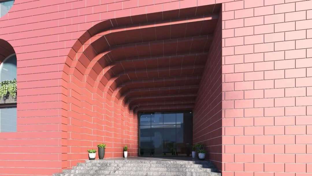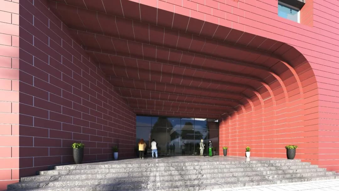 The use of textured surfaces and contrasting materials enhances the overall façade composition.