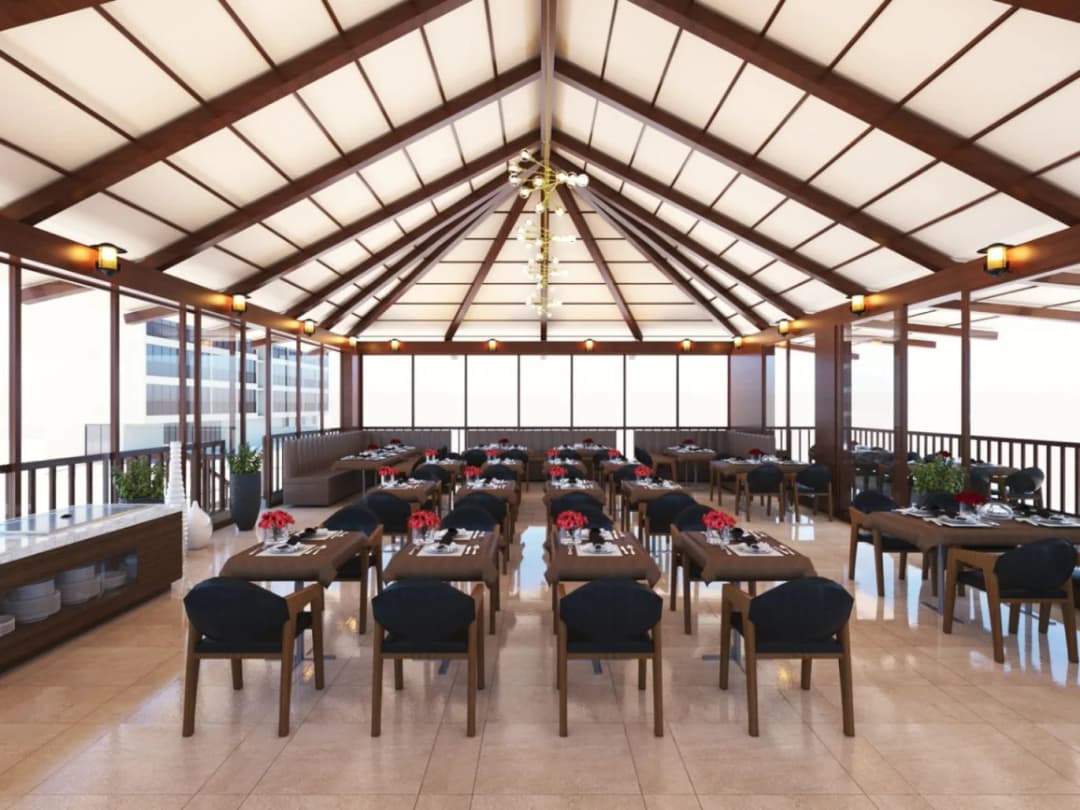 A contemporary hospitality interior designed to deliver a vibrant and spacious dining experience with modern aesthetics and natural light
