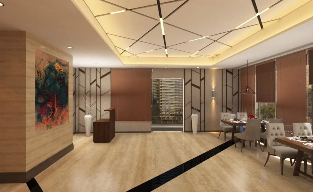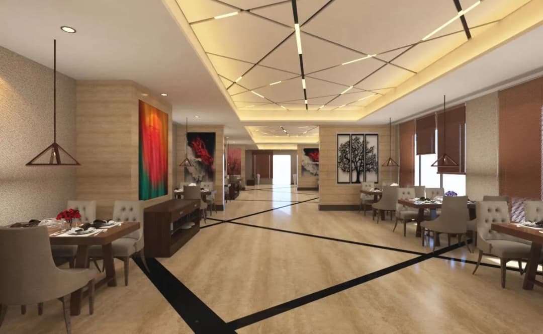 A contemporary restaurant interior designed to deliver a refined dining experience through geometric design elements, warm lighting, and efficient spatial planning tailored for high footfall.